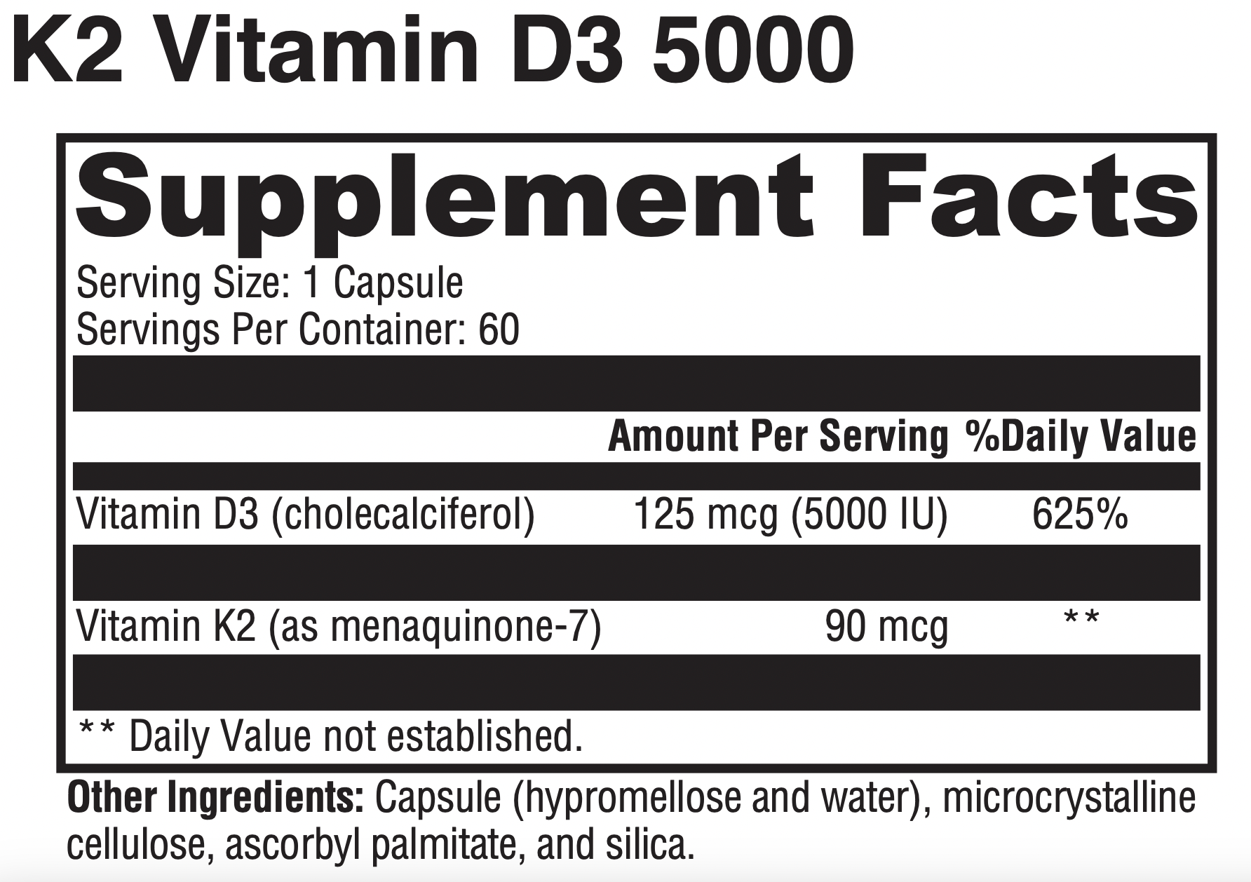D+K 5000 is complex of K2 and Vitamin D3 5000 that provides vitamin K2 as menaquinone-7 (MK-7), a highly bioavailable and bioactive form of K2. D+K 5000 also features vitamin D3 (cholecalciferol), the identical form in which vitamin D is derived in the body from cholesterol and synthesized by sunlight on the skin. Historical use and numerous studies have demonstrated the efficacy of vitamin K supplements for bone and cardiovascular health.*